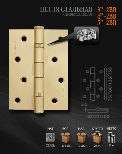 Н0255 Нора-М сталь 4"-2BB FHP (100х75х2,5) латунь б/колп. унив. Петля дверная