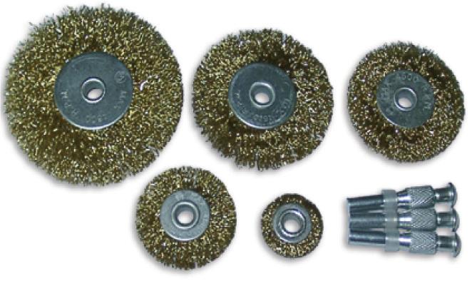 3419001 Набор щеток-крацовок со шпилькой (Ø 6 мм) для дрели, крученая стальная омедненная проволока (Ø 0,3 мм) :